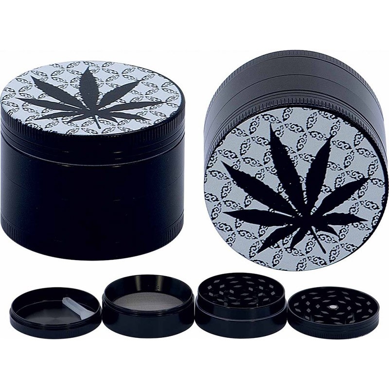 Metalowy, 4 częściowy młynek do tytoniu w kolorze czarnym. Posiada magnes, który ułatwia zamykanie. W skład młynka wchodzą: górna część ozdobiona motywem liścia, ostrza z dziurkami, metalowa siateczka i podstawka,w której znajduje się łopatka do zgarniania pyłku.