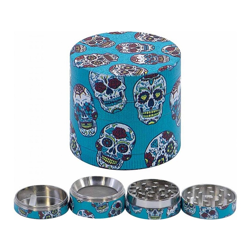 Mały, metalowy 4 częściowy młynek do tytoniu turkusowym . Posiada magnes, który ułatwia zamykanie. W skład młynka wchodzą: górna część ozdobiona aplikacją , ostrza z dziurkami, metalowa siateczka i podstawka,w której znajduje się łopatka do zgarniania pyłku.